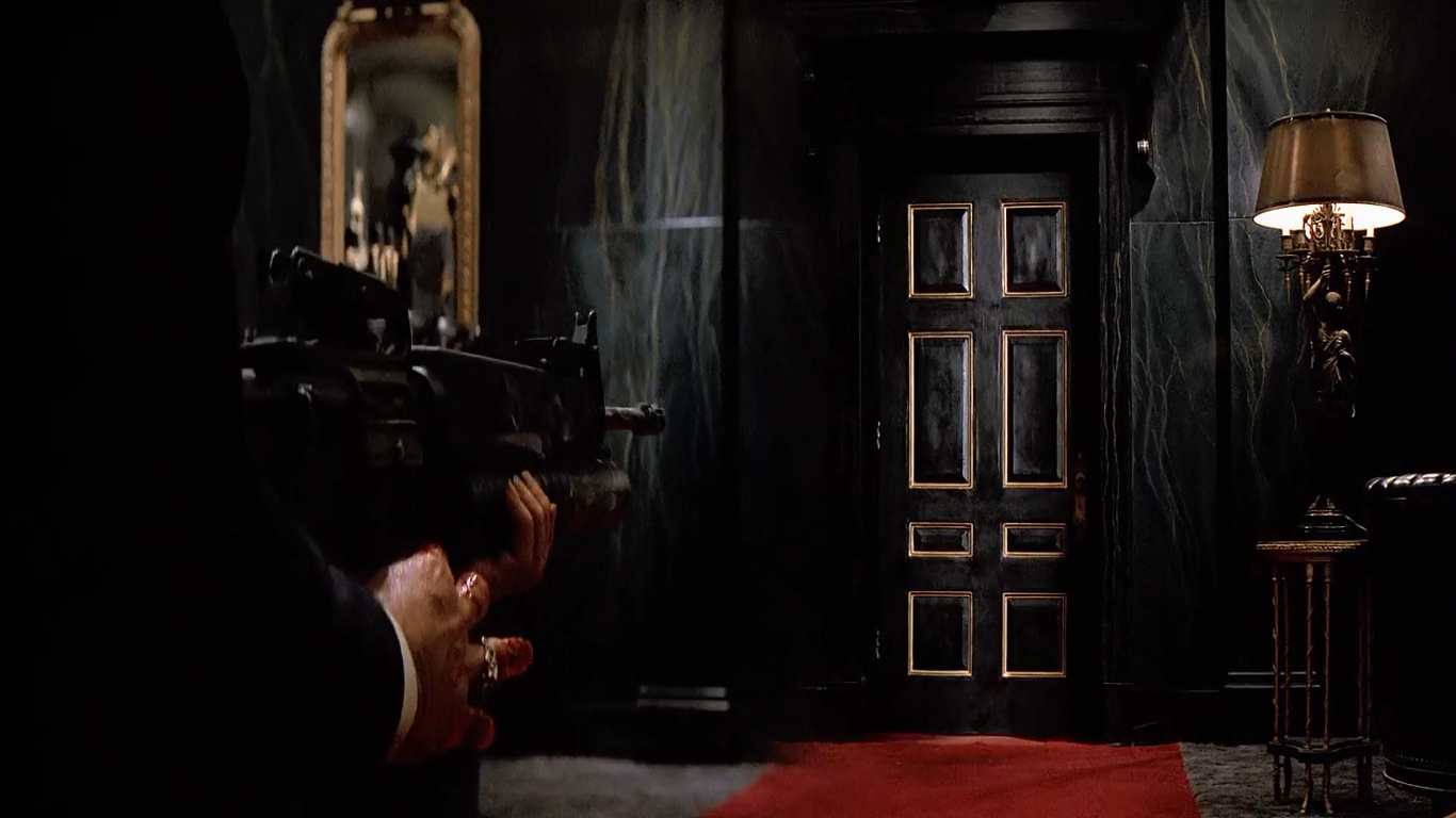 Há vários efeitos técnicos na cena bacanas, não só de tiros, como a explosão da porta, seguida pela fumaça de gelo seco. A montagem e edição da cena também é incrível, onde sempre me pergunto quantos tiros Tony tomou antes de cair. O filme termina com uma frase em dedicação ao diretor Howard Hawks, que dirigiu o Scarface original.